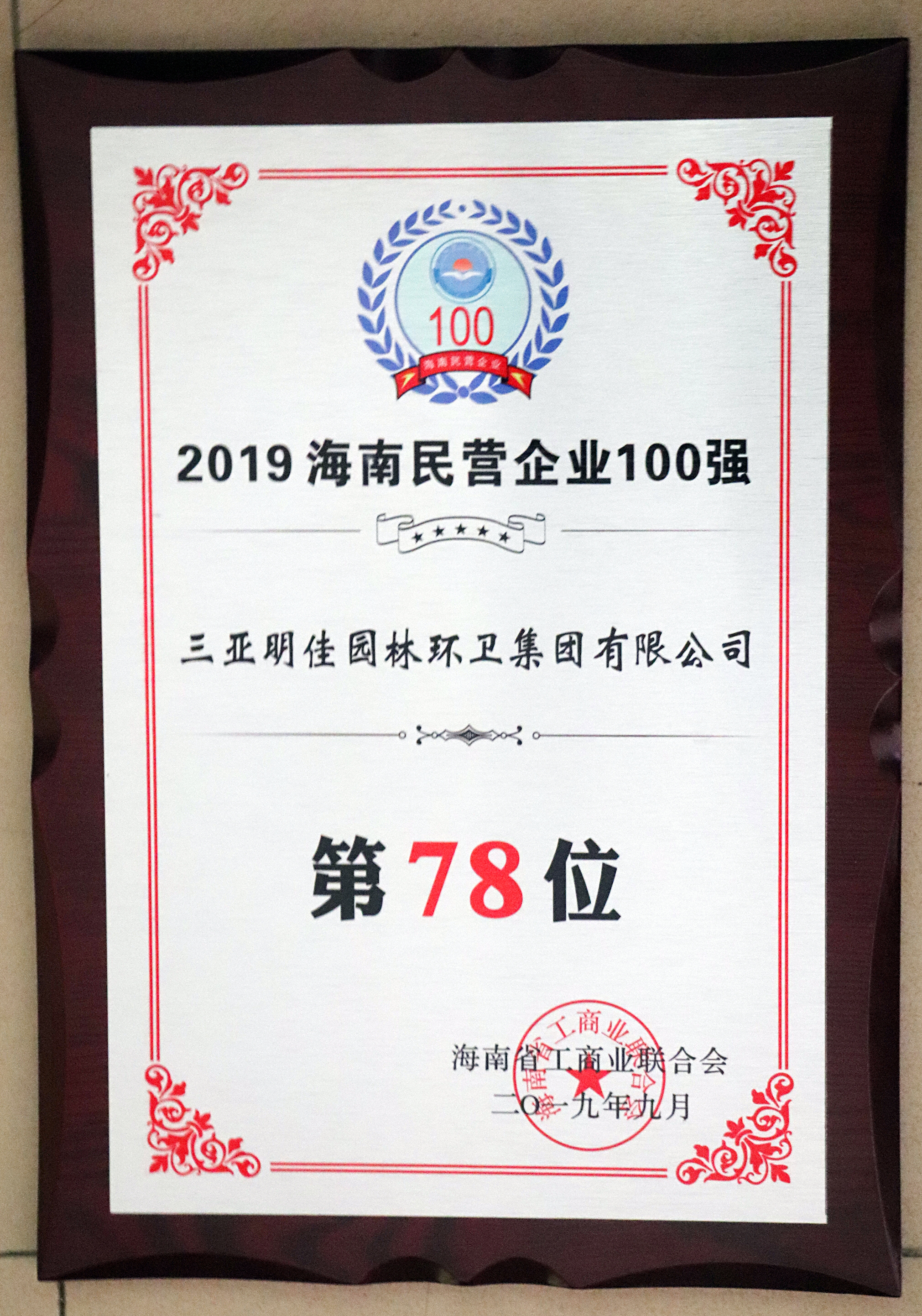 海南省工商聯(lián)24日在??诎l(fā)布2019海南省民營(yíng)企業(yè)100強(qiáng),三亞明佳園林環(huán)衛(wèi)集團(tuán)有限公司名列第78位。