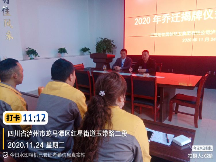 2020年11月24日,明佳集團(tuán)瀘州分公司新辦公室喬遷儀式隆重舉行。人大主任詹萬勇,區(qū)綜合行政執(zhí)法局環(huán)衛(wèi)股股長趙耿、重慶中仁公司昌總等領(lǐng)導(dǎo)來到明佳集團(tuán)瀘州分公司新辦公場地,為煥然一新的辦公樓正式啟用進(jìn)行喬遷揭牌。集團(tuán)公司生產(chǎn)質(zhì)安部副經(jīng)理鞠彬、集團(tuán)公司生產(chǎn)質(zhì)安部副經(jīng)理段永強(qiáng)、綜合辦公室、財務(wù)部、各部門管理人員共同見證這一歡慶時刻。