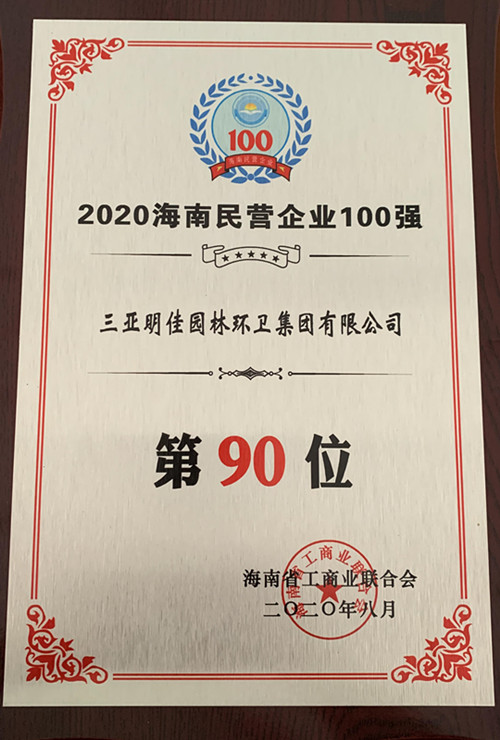 8月28日,“2020海南民營企業(yè)百強(qiáng)發(fā)布會(huì)”在??谂e行。三亞明佳園林環(huán)衛(wèi)集團(tuán)有限公司再次入選“海南民營企業(yè)100強(qiáng)”榜單,名列第90位。
