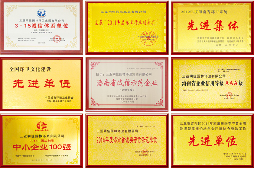 2017年2月1日,分別被三亞市園林環(huán)衛(wèi)局、吉陽(yáng)區(qū)環(huán)衛(wèi)所、天涯區(qū)城管局、海棠區(qū)城管局及三亞市愛(ài)衛(wèi)辦等主管部門(mén)評(píng)定為“環(huán)境衛(wèi)生先進(jìn)外包企業(yè)”