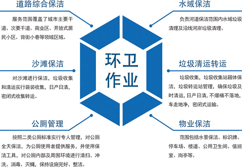截止2016年底,公司管理的環(huán)衛(wèi)水域沙灘保潔面積(近岸海域)3000多萬平方米,道路保潔3200多萬平方米,年清運垃圾20萬多噸。道路綜合保潔、水域保潔、沙灘保潔、垃圾清運轉運、公廁管理